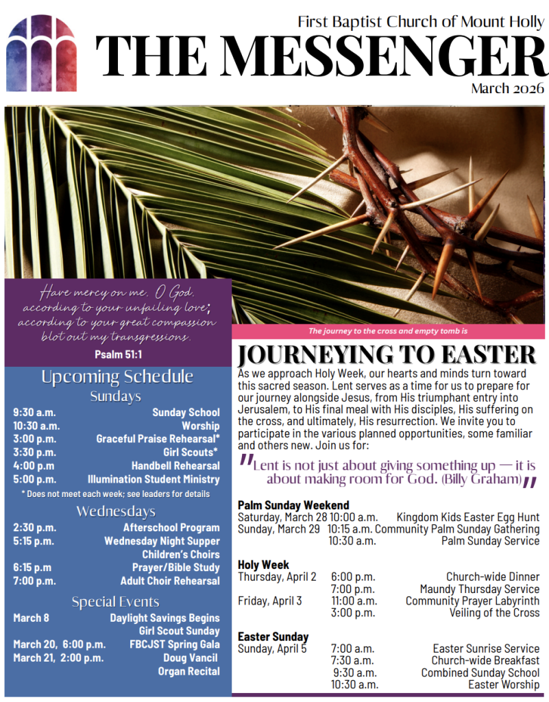 This month’s issue highlights our Lenten journey toward Easter, featuring articles from our staff, Holy Week and Easter schedules, and updates from various ministries around the church. Pick up a copy at church or visit here.